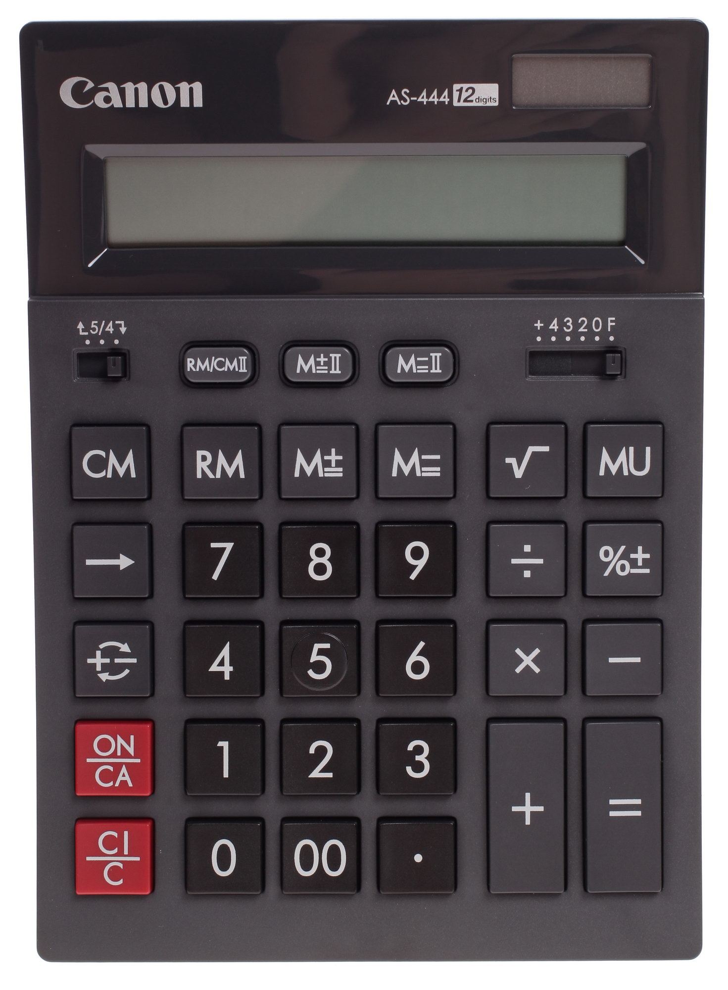 Бухгалтерский калькулятор Canon AS-444 имеет стильный запоминающийся дизайн. AS-444 оснащен дисплеем с наклоном, который способен отобразить одну строку. 12-разрядное устройство от компании Canon с легкостью высчитывает любые математические выражения и решает задачи, включая вычисление квадратного корня, подсчет процентов, а также выполняет округление и расчет наценки. Всего в арсенале модели 18 полноценных основных функций. Калькулятор может автоматически отключить питание, если длительное время находится в режиме ожидания.Кроме того, он работает от двух типов батарей – солнечных и батареек типа LR-44. Модель имеет два независимых модуля, которые делают ее универсальной в эксплуатации.